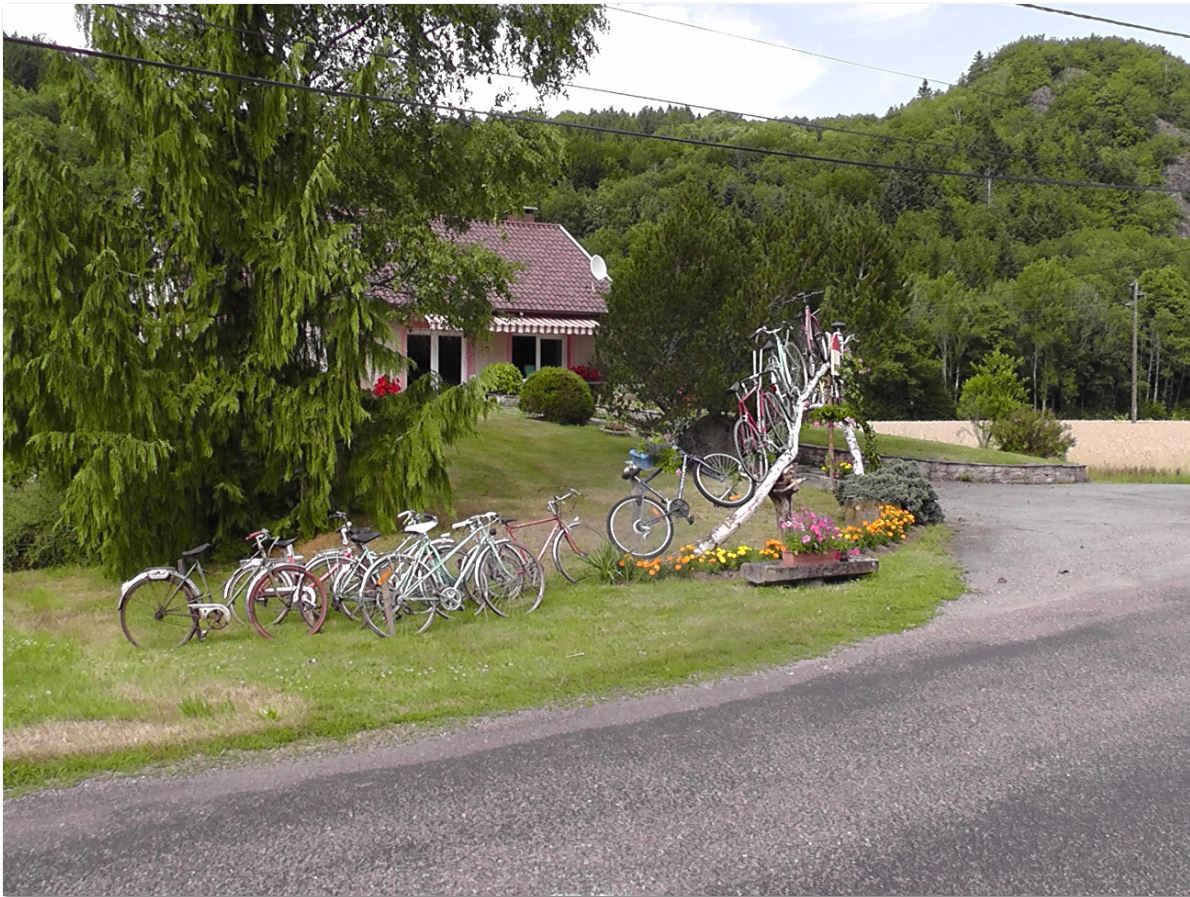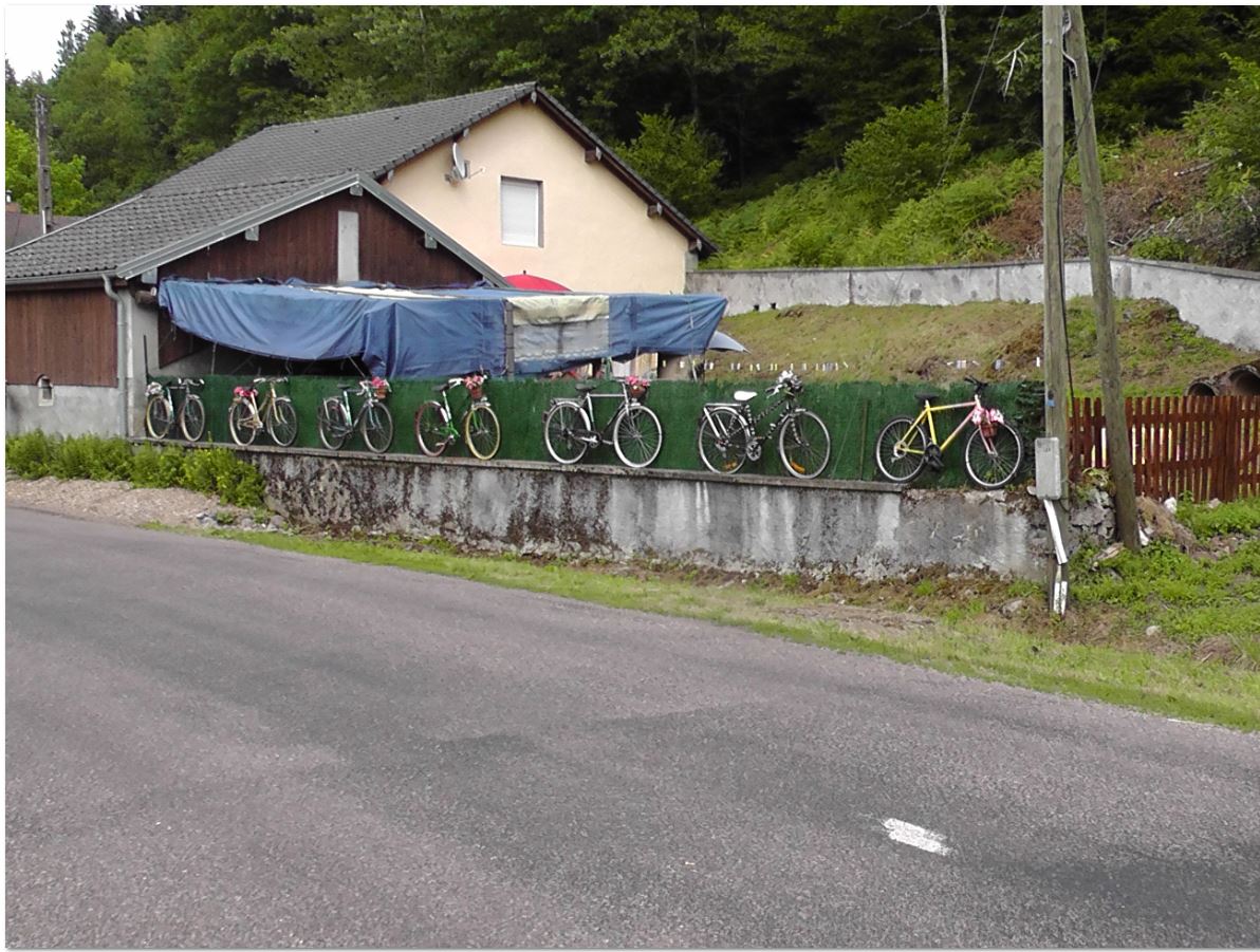 Ellie and I went for a walk into Saphoz – which is only 30 or so houses. It’s great to see the effort that people were making to decorate their homes with old bikes. Even the village sign had been decorated. There were also some banners for one of the riders, Thibaut Pinot – he’s from Mélisey which is around 20km from Saphoz – so a local lad.