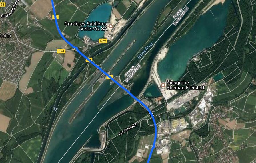We’d set the satnav to avoid motorways and that led us on a good route following the A5 in Germany. We then went over the Rhine – or rather what looked like three rivers but it is just the one river but with a couple of islands – as you can see from the satellite picture. I hadn’t actually realised that for long stretches of the Rhine, it forms the border between France and Germany – or what used to be called a border before Schengen.
