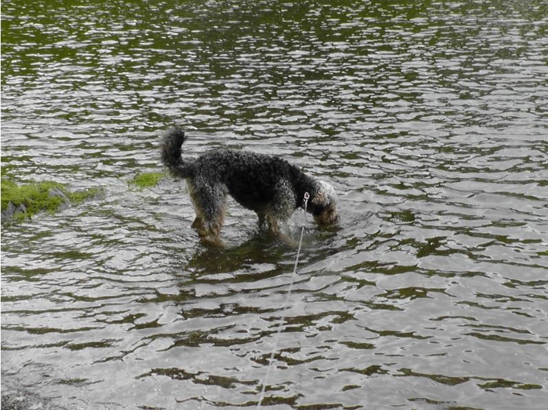 The rain stopped by the morning and the wind had died down so Ellie and I went for a long walk and ended up right alongside Derwent Water. She loves water so went wading in at various points.